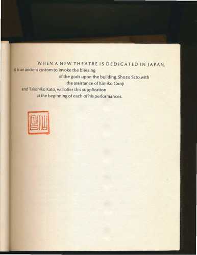 W H E N A N E W T H EAT R E I 5 D E D I CAT E D I N J A PA N, it is an ancient custom to invoke the blessing of the gods upon the building. Shozo Sato,with the assistance of Kimiko Gunji and Takehiko Kato, will offer this supplication at the beginning of each of his performances.