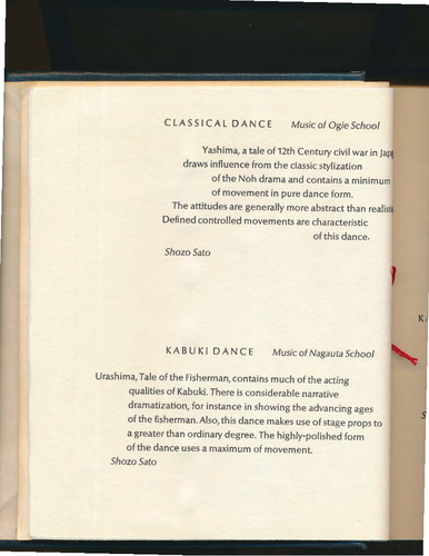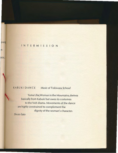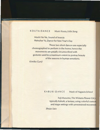 Notes for Program: Shozo Sato, Kabuki Dances from Japan Paper textured on printed side. Pages printed on one side only. Blank facing pages between each printed page not included in scan.
