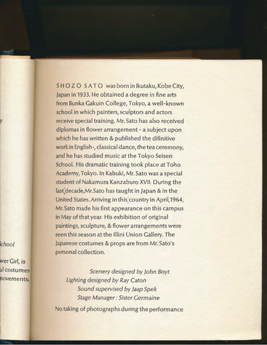 y ,choo/ wer Girl, is ul costumes novements. SH OZ O SATO was born in lkutaku, Kobe City, Japan in 1933. h!e obtained a degree in fine arts from Bunka Gakuin College, Tokyo, a well-known school in which painters, sculptors and actors receive special training. Mr. Sato has also received diplomas in flower arrangement - a subject upon which he has written & published the difinitive work in English-, classical dance, the tea ceremony, and he has studied music at the Tokyo Seisen School. His dramatic training took place at Toho Academy, Tokyo. In Kabuki, Mr. Sato was a special student of Nakamura Kanzaburo XVII. During the las(decade,Mr.Sato has taught in Japan & in the United States. Arriving in this~country in April,1964, Mr. Sato made his first appearance on this campus in May of that year. His exhibition of original paintings, sculpture, & flower arrangements were seen this season at the Illini Union Gallery. The Japanese costumes & props are from Mr. Sato's personal collection. Scenery designed by John Boyt Lighting designed by Ray Caton Sound supervised by Jaap Spek Stage Manager: Sister Germaine No taking of photographs during the performance