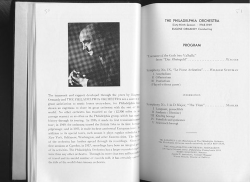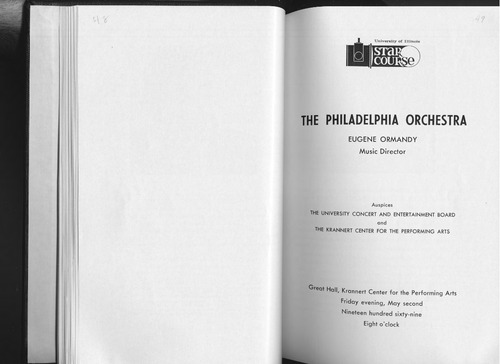 L\\ •1t2i,) THE PHILADELPHIA ORCHESTRA EUGENE ORMANDY Music Director Auspices THE UNIVERSITY CONCERT AND ENTERTAINMENT BOARD and THE KRANNERT CENTER FOR THE PERFORMING ARTS Great Hall, Krannert Center for the Performing Arts Friday evening, May second Nineteen hundred sixty-nine Eight o'clock