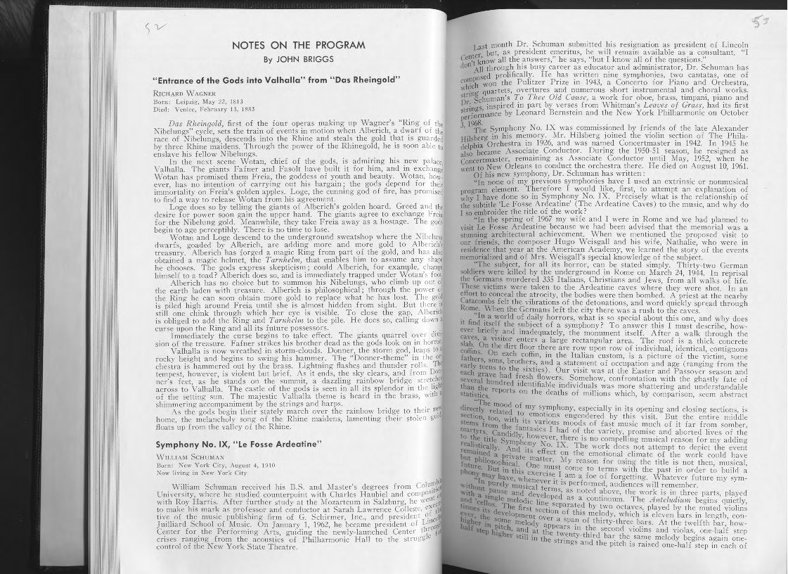 ) The teamwork and rapport developed through the years by E ugene Ormandy and THE PHILADELPHIA ORCHESTRA are a source oi great satisfaction to music lovers everywhere, fo r Philadelphia has shown an eagerness to share its great orchestra with the rest of the world. No other orchestra has traveled so far ( 12,500 miles in an average season) or so often as the Philadelphia group, which has made history through its touring. In 1936, it made its first transcontinental tour; in 1949, the orchestra toured the British Isles in its first foreign pilgrimage; and in 1955, it made its first continental European tour. In addition to its special tours, each season it plays regular schedules i 11 New York, Baltimore, .. Washington, and other Eastern cities. The fanit of the orchestra has further spread through its recordings. Since it; first sessions at Camden, in 1917, recordings have been an integral part of its activities. The Philadelphia Orchestra has a larger recorded reper- toire than any other orchestra. Through its more than two million 111i 1 \\ of travel and its untold number of records sold, it has certainly earne' the title of the world's best-known orchestra. THE PHILADELPHIA ORCHESTRA Sixty-Ninth Season · 1968-1 969 EUGENE ORMANDY Conducting PROGRAM ") I ·· Entrance of the Gods into Valhalla" from "Das Rheingold" ... .. . ... . .. . .......... \\\\ ' AGXER Symphony No. IX, " Le Fosse Ardeatine" .. .. \\ VILLL\\M ScnuMA:N I Anteludium II Offertorium III Postludium I Played without pause) ! XTERM lSSION ~ymphony No. 1 in D i\\Iajor, "The Titan" ....... . ..... :-IAIILER I Langsam; gemachlich lI Andante ( Blumine) I II Kraftig bewegt I\\' Feierlich uncl gemessen \\ ' Stiirmisch bewegt The B.\\Ll)\\\\' I N is the official piano of The Philadelphia Orchestra. Th e Phil aclclphi a Orchestra records exclusively for RCA RED SEAL. TI lE P lllLADELPILI A ORCHESTRA ASSOCIATION 230 South Fi fteenth Street, Philadelphia, P ennsylvania 19 102 BORIS SO 1':OLOFF, :\\Ianage r Joseph H. Santarla,ci, Assi stant ).fanager Wayne Shilkret , Director of Publicity
