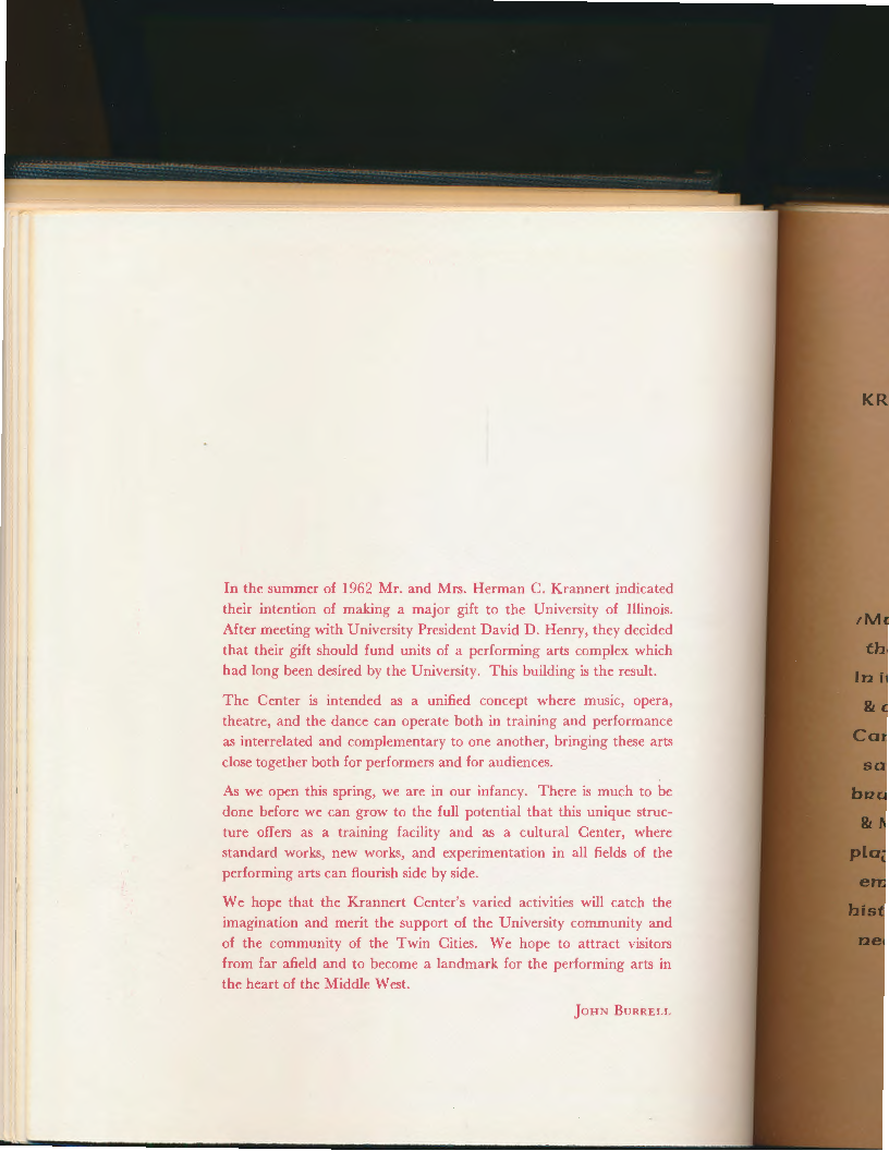 In the summer of 1962 Mr. and Mrs. Herman C. Krannert indicated their intention of making a major gift to the University of Illinois. After meeting with University President David D. Henry, they decided that their gift should fund units of a performing arts complex which had long been desired by the University. This building is the result. The Center is intended as a unified concept where music, opera, theatre, and the dance can operate both in training and performance as interrelated and complementary to one another, bringing these arts close together both for performers and for audiences. As we open this spring, we are in our infancy. There is much to be done before we can grow to the full potential that this unique struc- ture offers as a training facility and as a cultural Center, where standard works, new works, and experimentation in all fields of the performing arts can flourish side by side. We hope that the Krannert Center's varied activities will catch the imagination and merit the support of the University community and of the community of the Twin Cities. We hope to attract visitors from far afield and to become a landmark for the performing arts in the heart of the Middle West. JOHN BURRELL