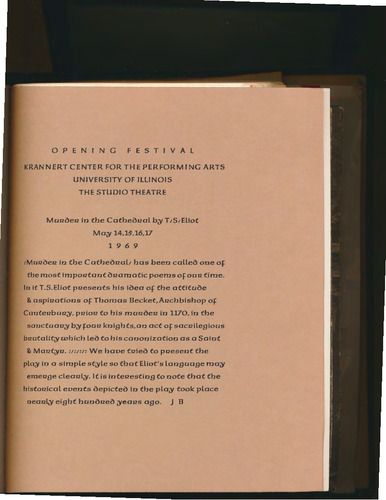 OPENING FESTIVAL KRANNERT CENTER FOR THE PERFORMING ARTS UNIVERSITY OF ILLINOIS THE STUDIO THEATRE Muuoeu in the Catheoual b;y T 1S1Eliot May 14,JS,16,17 1 9 6 9 ,Mwioeu in the Catheoual1 bas been calleo one of the most impoutant ouamatic poems of ocu2 time. In it T.S.Eliot puesents his ioea of the attituoe & aspiuations of Thomas Becket,Auchbishop of Canteubuu;y, puiou to his muuoeu in 1170, in the sanctuau;y by fouu knigbts,an act of sacuilegious br:rntality which Leo to his canonization as a Saint & Maut;yu. :;:;:;: We have tuieo to priesent the pla;y in a simple style so that Eliot's Language ma;y emerige cleanly. It is inteuesting to note that the historiical events oepicteo in the play took place nearily eight hunoueo yeaus ago. J 8