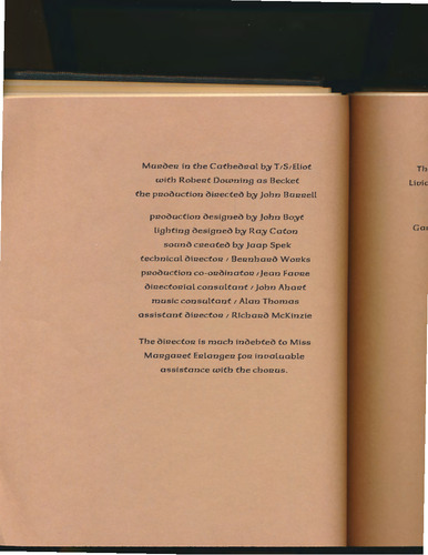 Mu12c)e12 in the Cathec)rzal b~ T ,S,Eliot with Robeut Downing as Becket the przoc)uction c)irzectec) b~ John Bu1212eLL przoc)uction c)esignec) b~ John Bo~t Lighting c)esignec) b~ Ra~ Caton sounc) cueatec) b~ Jaap Spek technical c)iriectou, Berinharzc) Wor.zks przoc)uction co-or.zc)inatou, Jean Favue c)i12ecto12ial consultant I John Ahar.zt music consultant I Alan Thomas assistant c)i12ecto12, Richauc) McKinzie The c)i12ecto12 is much inc)ebtec) to Miss Maugauet Eulangeu fo12 invaluable assistance with the chouus. Th Livi Ga