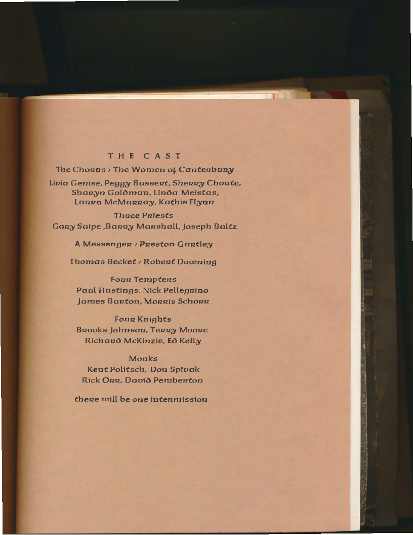 THE CAST The Chorius I The Women of Canteriburi~ Livia Genise, Pegg~ Busserit, Sheriri~ Choate, Shari~n Golaman, Linaa Meistas, Lauria McMuriria~, Kathie FL~nn Thriee Pr:ziests GaritY Saipe ,801212~ Marishall, Joseph Baltz A Messengeri I Prieston Garitle~ Thomas Becket I Roberit Downing Fouri Tempteris Paul Hastings, Nick Pellegriino James Bouton, Moririis Schoriri Fouri Knights 812ooksJohnson,Te1212~Moor2e Richaria McKinzie, Ea Kell~ Monks Kent Politsch, Don Spivak Rick 01212, Davia Pemberiton tberie will be one interimission