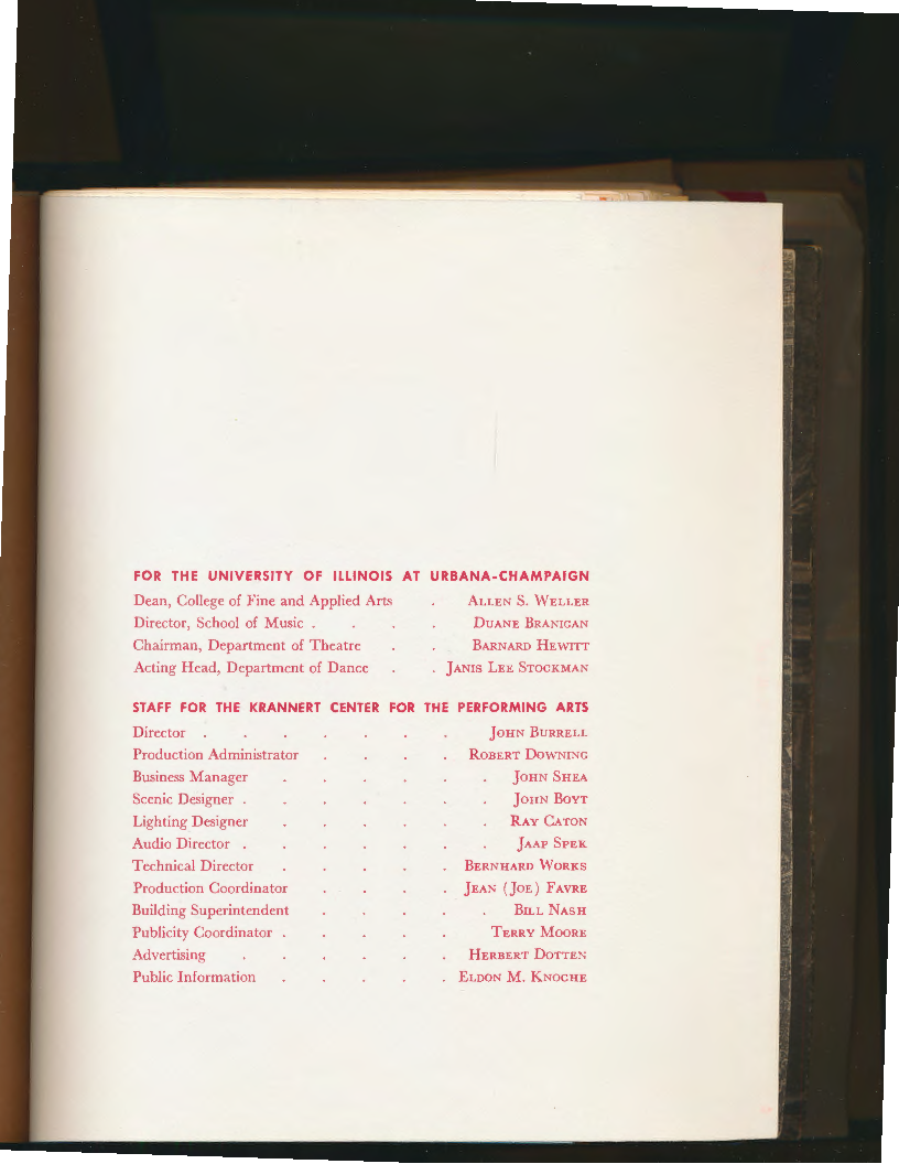 FO R THE UNIVERSITY OF ILLINOIS AT URBANA-CHAMPAIGN Dean, College of Fine and Applied Arts Director, School of Music . Chairman, Department of Theatre Acting Head, Department of Dance ALLEN s. \\ VELLER DUANE BRANIGAN B ARNARD H EWITT JANIS LEE STOCKMAN STAFF FOR THE KRANNERT CENTER FOR THE PERFORMING ARTS Director Production Administrator Business Manager Scenic Designer . Lighting Designer Audio Director . Technical Director Production Coordinator Building Superintendent Publicity Coordinator Advertising Public Information J oHN B uRRELL R OBERT D OWNING J OHN SHEA J OHN B OYT R AY CATON J AAP SPEK B ERNHARD WORKS J EAN ( J oE) FAVRE BILL NASH TERRY MOORE H ERBERT DoTTEN ELDON M. K NOCHE