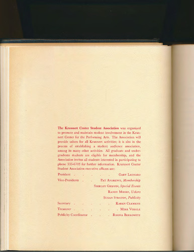 The Krannert Center Student Association was organized to promote and maintain student involvement in the Kran- nert Center for the Performing Arts. The Association will provide ushers for all Krannert activities; it is also in the process of establishing a student audience association, among its many other activities. All graduate and under- graduate students are eligible for membership, and the Association invites all students interested in participating to phone 333-6703 for further information. Krannert Center Student Association executive officers are: President Vice-Presidents Secretary Treasurer Publicity Coordinator GARY LEONARD PAT ANDREWS, Membership SHIRLEY GRIFFIN, Special Events RANDY MooRE, Ushers SusAN STRATON, Publicity KAREN CLEMENS . MIKE VoEGLE RHONA BERKOWITZ