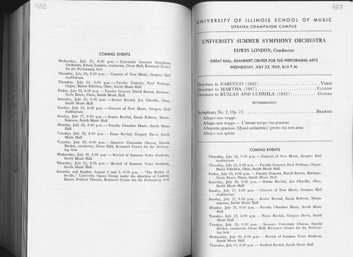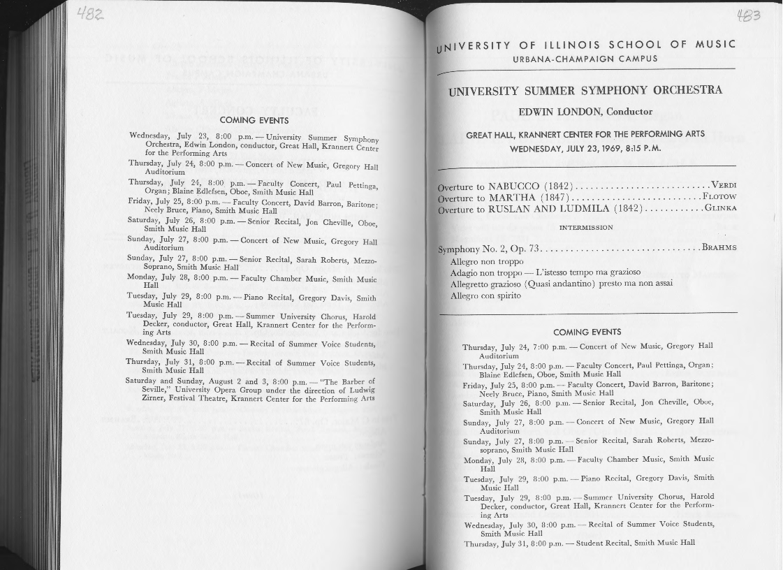 COMING EVENTS Wednesday, July 23, 8:00 p.m. - University Summer Symphony Orchestra, Edwin London, conductor, Great Hall, Krannert Center for the Performing Arts Thursday, July 24, 8:00 p.m. - Concert of New Music, Gregory Hall Auditorium Thursday, July 24, 8 :00 p.m. - Faculty Concert, Paul Pettinga, Organ; Blaine Edlefsen, Oboe, Smith Music Hall Friday, July 25, 8:00 p.m. -Faculty Concert, David Barron, Baritone; Neely Bruce, Piano, Smith Music Hall Saturday, July 26, 8 :00 p.m. - Senior Recital, Jon Cheville, Oboe, Smith Music Hall Sunday, July 27, 8:00 p.m. - Concert of New Music, Gregory Hall Auditorium Sunday, July 27, 8:00 p.m. - Senior Recital, Sarah Roberts, Mezzo. Soprano, Smith Music Halt Monday, July 28, 8:00 p.m. - Faculty Chamber Music, Smith Music Hall Tuesday, July 29, 8 :00 p.m. - Piano Recital, Gregory Davis, Smith Music Hall Tuesday, July 29, 8:00 p.m. - Summer University Chorus, Harold Decker, conductor, Great Hall, Krannert Center for the Perform- ing Arts Wednesday, July 30, 8 :00 p.m. - Recital of Summer Voice Students, Smith Music Hall Thursday, July 31, 8:00 p.m. -Recital of Summer Voice Students, Smith Music Hall Saturday and Sunday, August 2 and 3, 8 :00 p.m. - "The Barber ?f Seville," University Opera Group under the direction of Ludwig Zirner, Festival Theatre, Krannert Center for the Performing Arts UNIVERSIT Y OF ILLINOIS SCHOOL URBANA-CHAMPAIGN CAMPUS OF MUSIC UNIVERSITY SUMMER SYMPHONY ORCHESTRA EDWIN LONDON, Conductor GREAT HALL, KRANNERT CENTER FOR THE PERFORMING ARTS WEDNESDAY, JULY 23, 1969, 8:15 P.M. 't-83 Overture to NABUCCO ( 1842) ........................... VERDI Overture to MARTHA ( 184 7) .......................... FLOTOW Overture to R US LAN AND L UDMILA ( 1842) ............ GLINKA INTERMISSION Symphony No. 2, Op. 73 ................................ BRAHMS Allegro non troppo Adagio non troppo - L'istesso tempo ma grazioso Allegretto grazioso ( Quasi andantino) presto ma non assai Allegro con spirito COMING EVENTS Thursday, July 24, 7 :00 p.m. - Concert of New Music, Gregory Hall Auditorium Thursday, July 24, 8 :00 p.m. - Faculty Concert, Paul Pettinga, Organ; Blaine Edlefsen, Oboe, Smith Music Hall Friday, July 25, 8:00 p.m. -Faculty Concert, David Barron, Baritone; Neely Bruce, Piano, Smith Music Hall Saturday, July 26, 8:00 p.m. - Senior Recital, Jon Cheville, Oboe, Smith Music Hall Sunday, July 27, 8:00 p.m.-Concert of New Music, Gregory Hall Auditorium Sunday, July 27, 8:00 p.m. -Senior Recital, Sarah Roberts, Mezzo- soprano, Smith Music Hall Monday, July 28, 8:00 p.m. - Faculty Chamber Music, Smith Music Hall Tuesday, July 29, 8:00 p.m. - Piano Recital, Gregory Davis, Smith Music Hall Tuesday, July 29, 8 :00 p .m. - Summer University Chorus, Harold Decker, conductor, Great Hall, Krannert Center for the Perform- ing Arts Wednesday, July 30, 8 :00 p.m. - Recital of Summer Voice Students, Smith Music Hall Thursday, July 31, 8 :00 p.m. - Student Recital. Smith Music Hall