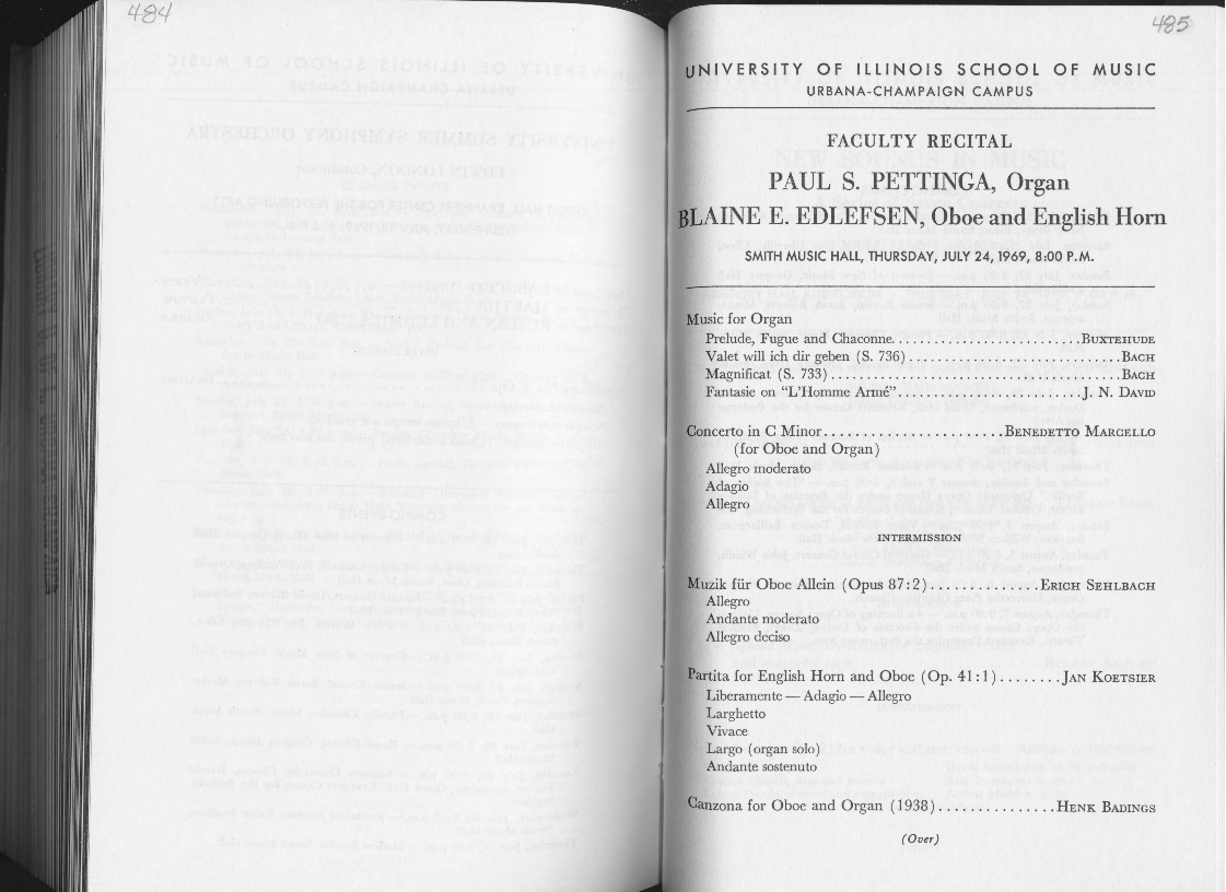 l(tjt\_/ UNIVERSITY OF ILLINOIS SCHOOL OF MUSIC URBANA-CHAMPAIGN CAMPUS FACULTY RECITAL PAUL S. PETTINGA, Organ BLAINE E. EDLEFSEN, Oboe and English Horn SMITH MUSIC HALL, THURSDAY, JULY 24, 1969, 8:00 P.M. Music for Organ Prelude, Fugue and Chaconne .... . ... . ......... .... ... . . BUXTEHUDE Valet will ich dir geben (S. 736) ............. .... . .... ........ BACH Magnificat ( S. 733) ......................................... BACH Fantasie on "L'Homme Arme" .. ...... ........... ... ... . J. N. DAVID Concerto in C Minor ....................... BENEDETTO MARCELLO ( for Oboe and Organ) Allegro moderato Adagio Allegro INTERMISSION Muzik fiir Oboe Allein ( Opus 87: 2) .............. ERICH SEHLBACH Allegro Andante moderato Allegro deciso Partita for English Horn and Oboe ( Op. 41 : 1) ........ JAN KoETSIER Liberamente - Adagio - Allegro Larghetto Vivace Largo ( organ solo) Andante sostenuto Canzona for Oboe and Organ ( 1938) ............... HENK BADINGS (Over) 5