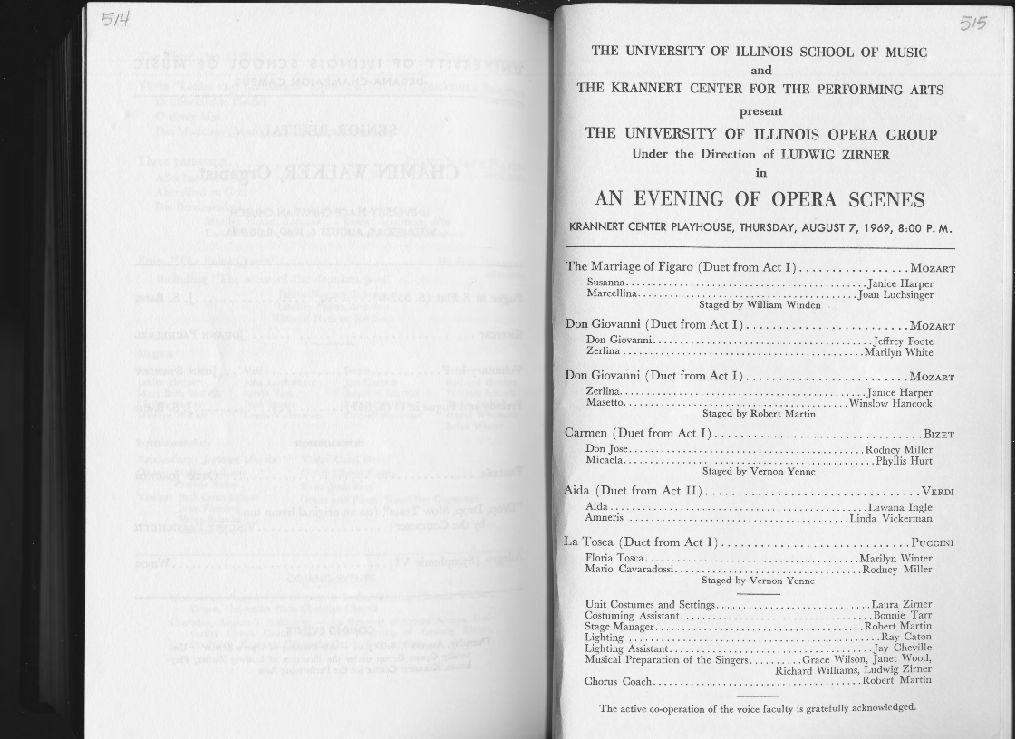 14 THE UNIVERSITY OF ILLINOIS SCHOOL OF MUSIC and THE KRANNERT CENTER FOR THE PERFORMING ARTS present THE UNIVERSITY OF ILLINOIS OPERA GROUP Under the Direction of LUDWIG ZIRNER in AN EVENING OF OPERA SCENES KRANNERT CENTER PLAYHOUSE, THURSDAY, AUGUST 7, 1969, 8:00 P. M. The Marriage of Figaro ( Duet from Act I) ................. MozART Susanna ........... . ............. .... .... . ........... Janice Harper Marcellina ..... ...... ................. . ............ Joan Luchsinger Staged by William Winden Don Giovanni ( Duet from Act I) ......................... MozART Don Giovanni. .. .. ............... ....... ....... ....... Jeffrey Foote Zerlina ............................................. Marilyn White Don Giovanni ( Duet from Act I) ......................... MozART Zerlina .............................................. Janice Harper Masetto .......................................... Winslow Hancock Staged by Robert Martin Carmen (Duet from Act I) ................................ BIZET Don Jose ................................... ...... ... Rodney Miller Micaela ............................................... Phyllis Hurt Staged by Vernon Yenne Aida ( Duet from Act II) ................................. VERDI Aida ....................... .... ....... .. ..... . . .... . Lawana Ingle Amneris . ...... ..... ............................. Linda Vickerman La Tosca (Duet from Act I ) ............................. PuccINI Floria Tosca ........................................ Marilyn Winter Mario Cavaradossi ................................... Rodney Miller Staged by Vernon Yenne Unit Costumes and Settings ............................. Laura Zimer Costuming Assistant. . ............... ............. .. . . .. Bonnie Tarr Stage Manager ........ .. .. ....... .................... Robert Martin Lighting ............................................... Ray Caton Lighting Assistant ...................................... Jay Cheville Musical Preparation of the Singers .......... Grace Wilson, Janet Wood, Richard Williams, Ludwig Zirner Chorus Coach ........ . .. ........ ............ . .. .. ... Robert M artin The active co-operation of the voice faculty is gratefully acknowledged. 5