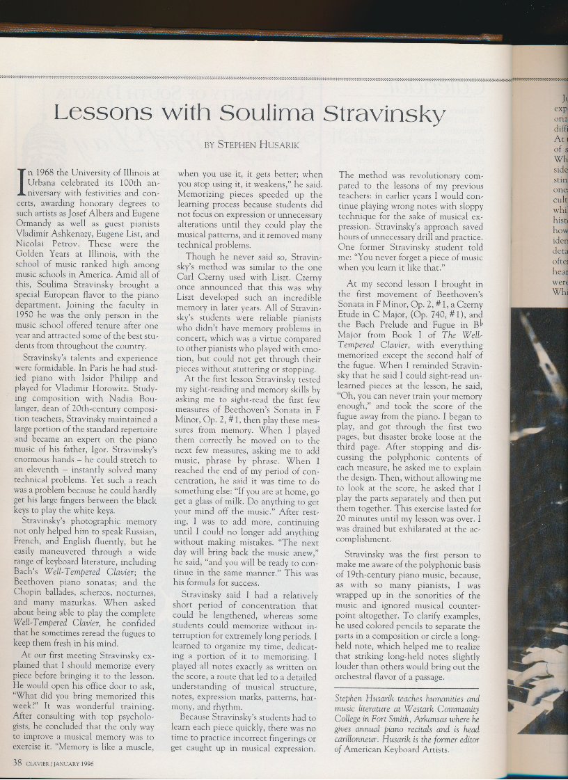 ····•·❖,•-·· ··•-•:·:•.•,•···•·❖·• •,• •,• •,•. ,•·❖ •••• '• : •:•:•:•:·:•:·:•:•:•:•:•:•:❖:•:•:•:•:·:•:•:•:•:•:•:•:•:•:•:•:•:•:•:•:•:•:•:•:•:•:-:-:•:•:•:❖:•:•:•:•:•:•:•:•:•:•:•:•:•:•:•:•:❖:•:•:•:•:•:•:•:•:❖:•:❖:•:•:•:•:•:•:•:•:•:•:•:❖:•:•:•:•:•:•:•:•:•:•:•:•:•:•:❖:-:•:❖:•:❖:•:•:•:•:❖:•:•:•:•:•:•:•:•:•:•:•:•:•:•:•:❖:•:❖:•:•:❖:•:•:•:•:•:•:❖:•:•:•:•:❖:•:•:•:•:❖:•:•:•:❖:•:❖:•:•:•:•:•:•:•:•:•:•:•:•:❖:•:-:•:•:•:❖:•:❖:•:•:•:•:•:•:-:•:•:•:-:❖:•:•:•:•:❖:•:•:•:•:•:•:❖:•:❖:•:•:•:•:•:•:•:•:•:❖· 9/.9.'/.•:,:,.,::-:.-..:,:,:: .. ,....:.-..:-:-:-:-::,:.~ Lessons with Soulima Stravinsky In 1968 the University of lllinois at Urbana celebrated its 100th an-niversary with festivities and con- certs, awarding honorary degrees to such artists as Josef Albers and Eugene Ormandy as well as guest pianists Vladimir Ashkenazy, Eugene List, and Nicolai Petrov. These were the Golden Years at lllinois, with the school of music ranked high among music schools in America. Amid all of this, Soulima Stravinsky brought a special European flavor to the piano department. Joining the facu lty in 1950 he was the only person in the music school offered tenure after one year and attracted some of the best stu- dents from throughout the country. Stravinsky's talents and experience were formidable. In Paris he had stud- ied piano with Isidor Philipp and played for Vladimir Horowitz. Study- ing composition with Nadia Bou- langer, dean of 20th-century composi- tion teachers, Stravinsky maintained a large portion of the standard repertoire and became an expert on the piano music of his father, Igor. Stravinsky's enormous hands - he could stretch to an eleventh - instantly solved many technical problems. Yet such a reach was a problem because he could hardly get his large fingers between the black keys to play the white keys. Stravinsky's photographic memory not only helped him to speak Russian, French, and English fluently, but he easily maneuvered through a wide range of keyboard literature, including Bach's Well-Tempered Clavier; the Beethoven piano sonatas; and the Chopin ballades, scherzos, nocturnes, and many mazurkas. When asked about being able to play the complete Well-Tempered Clavier, he confided that he sometimes reread the fugues to keep them fresh in his mind. At our first meeting Stravinsky ex- plained that I should memorize every piece before bringing it to the lesson. He would open his office door to ask, "What did you bring memorized this week?" It was wonderful training. After consulting with top psycholo- gists, he concluded that the only way to improve a musical memory was to exercise it. "Memory is like a muscle, 38 CLAVIER/JANUARY 1996 BY STEPHEN HUSARIK when you use it, it gets better; when you stop using it, it weakens," he said. Memorizing pieces speeded up the learning process because students did not focus on expression or unnecessary alterations until they could play the musical patterns, and it removed many technical problems. Though he never said so, Stravin- sky's method was similar to the one Carl Czerny used with Liszt. Czerny once announced that this was why Liszt developed such an incredible memory in later years. All of Stravin- sky's students were reliable pianists who didn't have memory problems in concert, which was a virtue compared to other pianists who played with emo- tion, but could not get through their pieces without stuttering or stopping. At the first lesson Stravinsky tested my sight-reading and memory skills by asking me to sight-read the first few measures of Beethoven's Sonata in F Minor, Op. 2, #I, then play these mea- sures from memory. When I played them correctly he moved on to the next few measures, asking me to add music, phrase by phrase. When I reached the end of my period of con- centration, he said it was time to do something else: "If you are at home, go get a glass of milk. Do anything to get your mind off the music." After rest- ing, I was to add more, continuing until I could no longer add anything without making mistakes. "The next day will bring back the music anew," he said, "and you will be ready to con- tinue in the same manner." This was his formula for success. Stravinsky said I had a relatively short period of concentration that could be lengthened, whereas some students could memorize without in- terruption for extremely long periods. I learned to organize my time, dedicat- ing a portion of it to memorizing. I played all notes exactly as written on the score, a route that led to a detailed understanding of musical structure, notes, expression marks, patterns, har- mony, and rhythm. Because Stravinsky's students had to learn each piece quickly, there was no time to practice incorrect fingerings or get caught up in musical expression. The method was revolutionary com- pared to the lessons of my previous teachers: in earlier years I would con- tinue playing wrong notes with sloppy technique for the sake of musical ex- pression. Stravinsky's approach saved hours of unnecessary drill and practice. One former Stravinsky student told me: "You never forget a piece of music when you learn it like that." At my second lesson I brought in the first movement of Beethoven's Sonata in F Minor, Op. 2, # 1, a Czerny Etude in C Major, (Op. 740, #1), and the Bach Prelude and Fugue in Bb Major from Book I of The Well- Tempered Clavier, with everything memorized except the second half of the fugue. When I reminded Stravin- sky that he said I could sight-read un- learned pieces at the lesson, he said, "Oh, you ca