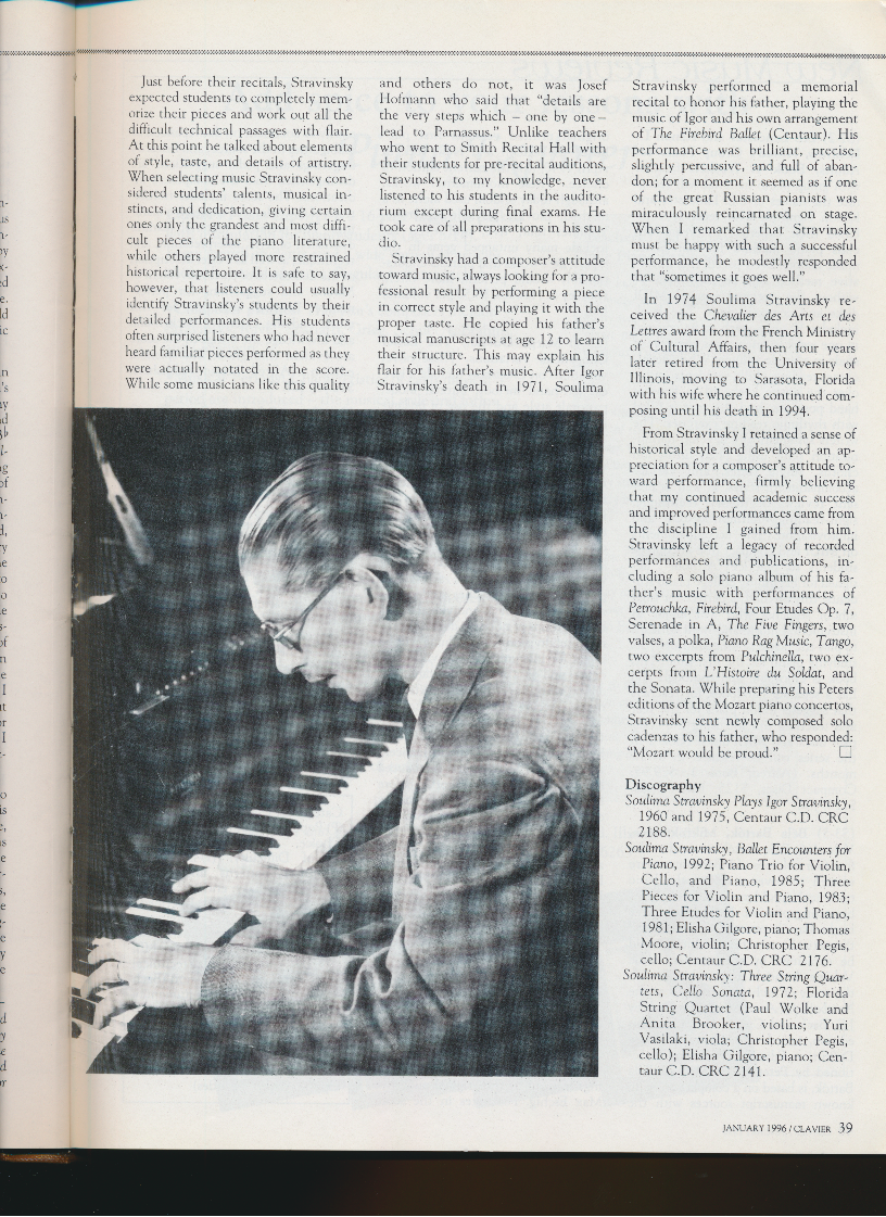 y d d C n 's g f 0 e f e I s s e Just before their recitals, Stravinsky expected students to completely mem- orize their pieces and work out all the difficult technical passages with flair. At this point he talked about elements of style, taste, and details of artistry. When selecting music Stravinsky con- sidered students' talents, musical in- stincts, and dedication, giving certain ones only the grandest and most diffi- cult pieces of the piano literature, while others played more restrained historical repertoire. It is safe to say, however, that listeners could usually identify Stravinsky's students by their detailed performances. His students often surprised listeners who had never heard familiar pieces performed as they were actually notated in the score. While some musicians like this quality and others do not, it was Josef Hofmann who said that "details are the very steps which - one by one - lead to Parnassus." Unlike teachers who went to Smith Recital Hall with their students for pre-recital auditions, Stravinsky, to my knowledge, never listened to his students in the audito- rium except during final exams. He took care of all preparations in his stu- dio. Stravinsky had a composer's attitude toward music, always looking for a pro- fessional result by performing a piece in correct style and playing it with the proper taste. He copied his father's musical manuscripts at age 12 to learn their structure. This may explain his flair for his father's music. After Igor Stravinsky's death in 1971, Soulima Stravinsky performed a memorial recital to honor his father, playing the music oflgor a11d his own arrangement of The Firebird Ballet (Centaur). His performance was brilliant, precise, slightly percussive, and full of aban- don; for a moment it seemed as if one of the great Russian pianists was miraculously reincarnated on stage. When I remarked that Stravinsky must be happy with such a successful performance, he modestly responded that "sometimes it goes well." In 1974 Soulima Stravinsky re- ceived the Chevalier des Arts et des Lettres award from the French Ministry of Cultural Affairs, then four years later retired from the University of Illinois, moving to Sarasota, Florida with his wife where he continued com- posing until his death in 1994. From Stravinsky I retained a sense of historical style and developed an ap- preciation for a composer's attitude to- ward performance, firmly believing that my continued academic success and improved performances came from the discipline I gained from him. Stravinsky left a legacy of recorded performances and publications, in- cluding a solo piano album of his fa- ther's music with performances of Petrouchka, Firebird, Four Etudes Op. 7, Serenade in A, The Five Fingers, two valses, a polka, Piano Rag Music, Tango, two excerpts from Pulchinella, two ex- cerpts from L' His wire du Sok/at, and the Sonata. While preparing his Peters editions of the Mozart piano concertos, Stravinsky sent newly composed solo cadenzas to his father, who responded: "Mozart would be proud." D Discography Soulima Stravinsky Plays Igor Stravinsky, 1960 and 1975, Centaur C.D. CRC 2188. Soulima Stravinsky, Ballet Encounters for Piano, 1992; Piano Trio for Violin, Cello, and Piano, 1985; Three Pieces for Violin and Piano, 1983; Three Etudes for Violin and Piano, 1981; Elisha Gilgore, piano; Thomas Moore, violin; Christopher Pegis, cello; Centaur C.D. CRC 2176. Soulima Stravinsky: Three String Quar- tets, Cello Sonata, 1972; Florida String Quartet (Paul Wolke and Anita Brooker, violins; Yuri Vasilaki, viola; Christopher Pegis, cello); Elisha Gilgore, piano; Cen- taur C.D. CRC 2141. JANUARY 1996/CLAVIER 39